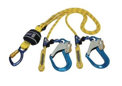 Sala 2 metre twin access rope lanyard. Rope Adjuster on legs with Triple Action Karabiner and Double Action Scaffold Hooks on each end.