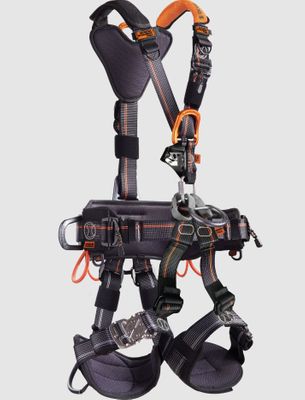 Harness features: Fallindicator, Integrated chest ascender, Lanyard parking ring, Adjustable leg loop fixation